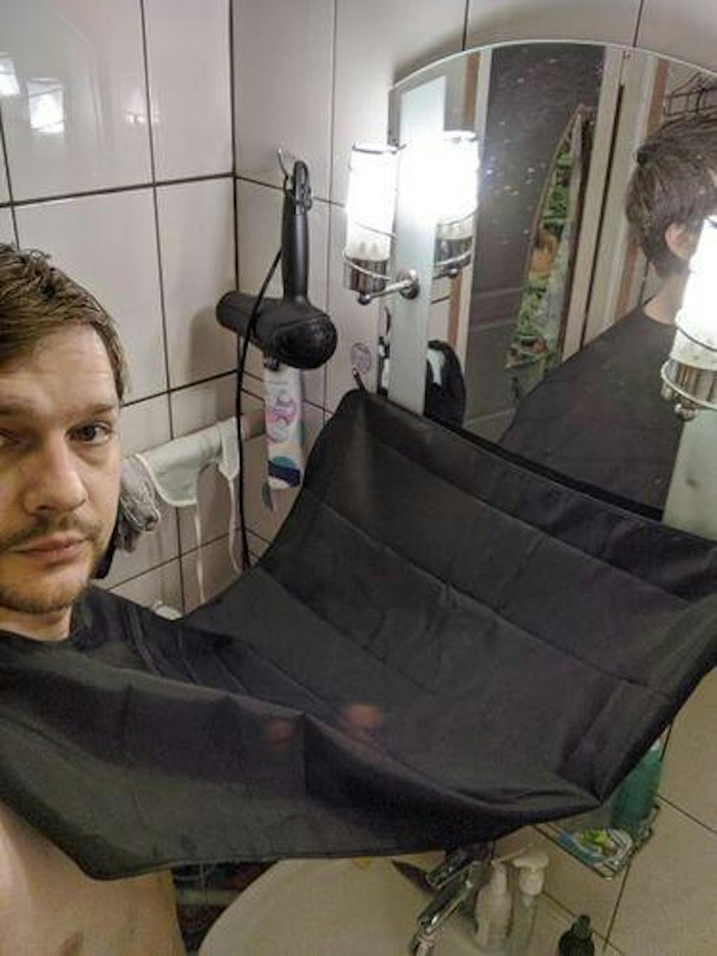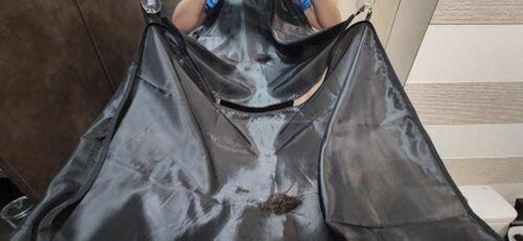 Simply secure the velcro neck straps and attach the suction cups to the mirror or another smooth surface. You can use the Loop Holders for pausing sessions, then when you're done, just detach the cape, slide the hair trimmings into the trash.