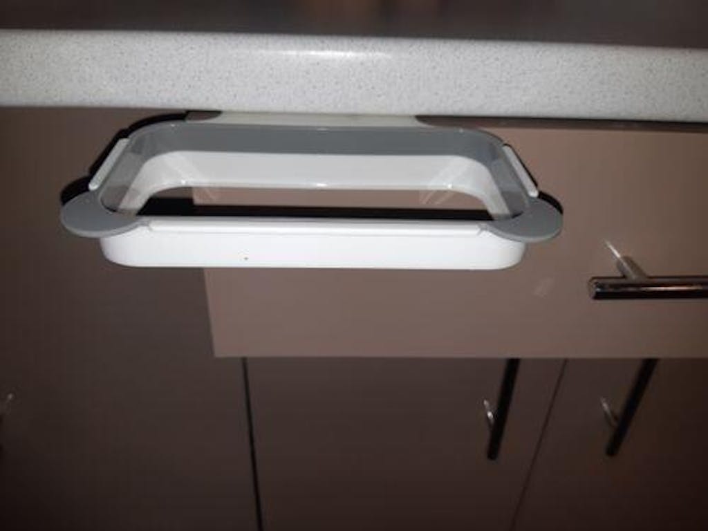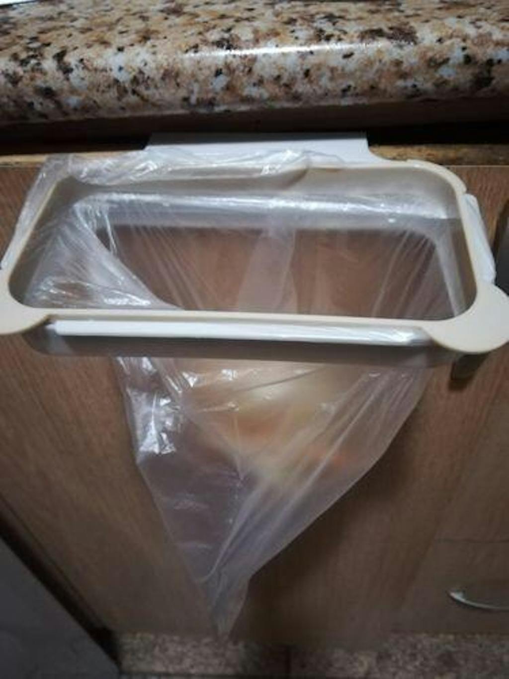 Hang this handy, Trash Rack Holder anywhere. It can be used in so many different places! Easily hooks on doors, cabinets and drawers. This trash bag holder is practical and functional and makes disposing of small waste items and food scraps easy and convenient.